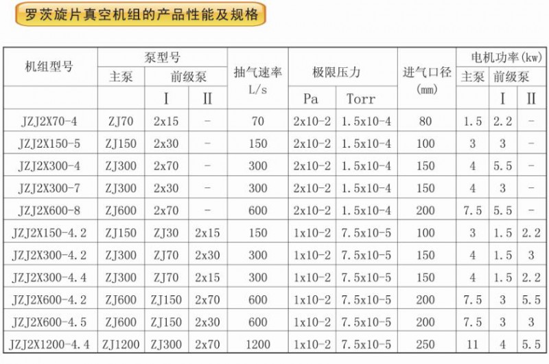 羅茨旋片真空機組的產品介紹JSJ2X型羅茨旋片真空機組是以羅茨泵為主泵,以旋片泵為前泵串聯而成。其結構緊湊,操作方便。使用于除空氣及其它無可凝性及無腐蝕性氣體,廣泛應用于需要大抽速和高真空的各種真空系統中。如:真空冶煉電力電容器、變壓器、真空浸漬處理、真空鍍膜設備中的預抽等。